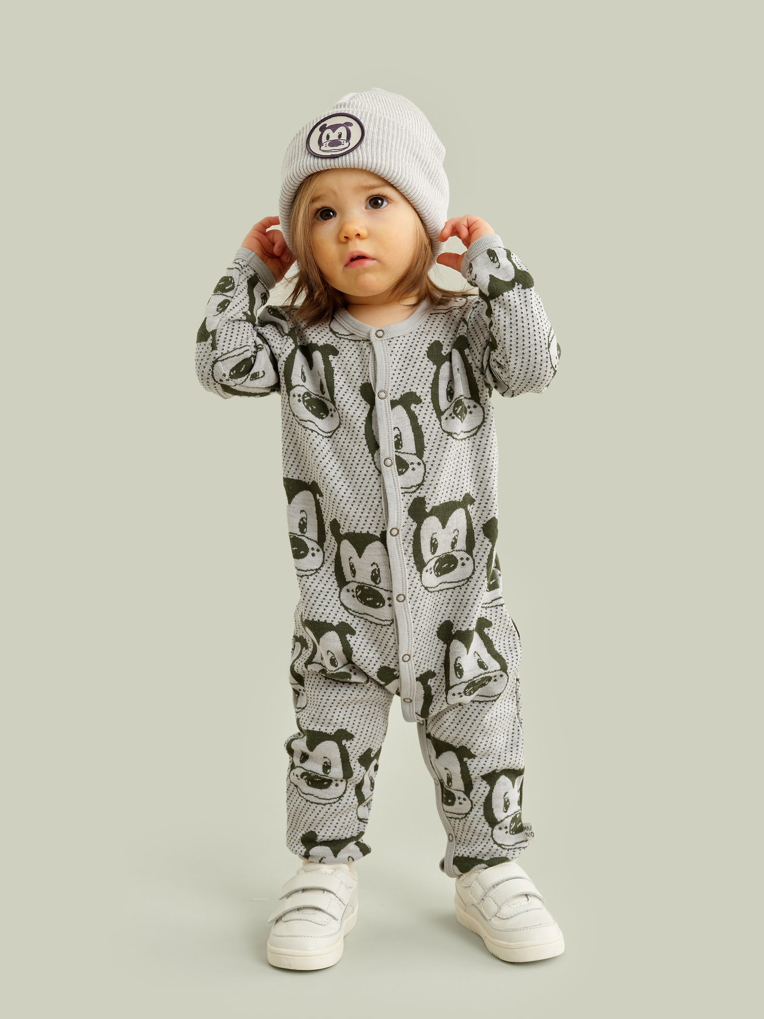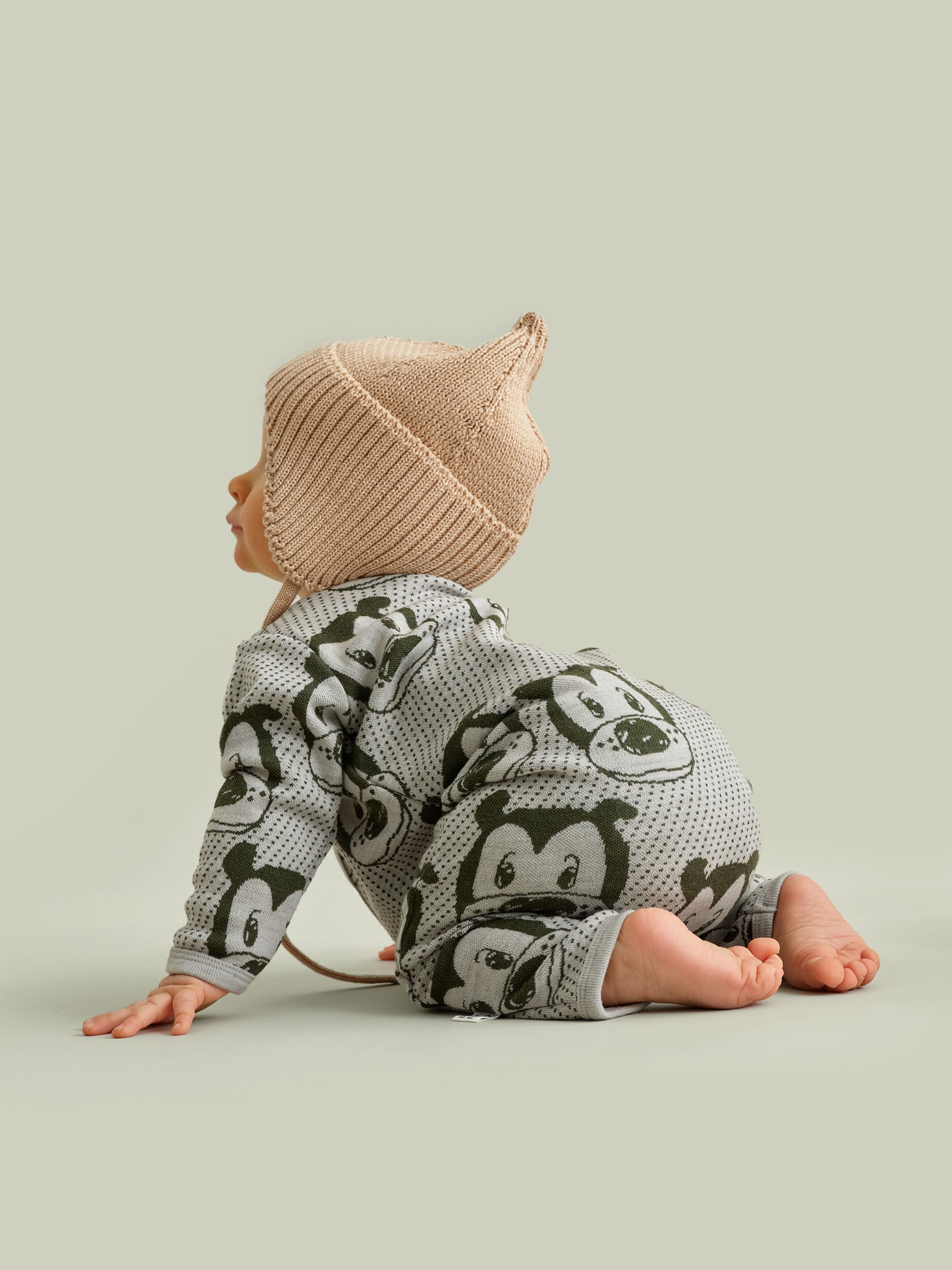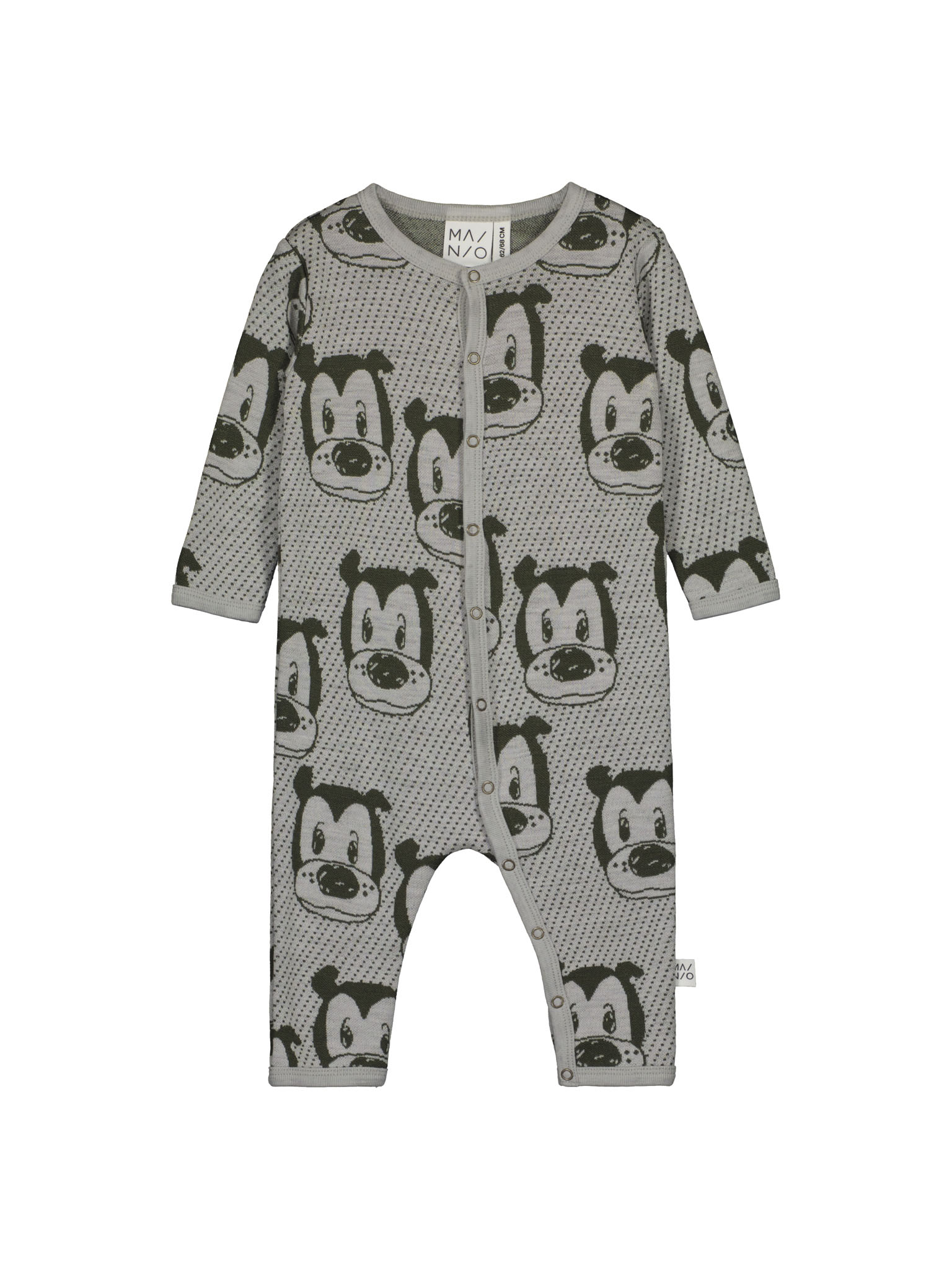Jacquardstickad one-piece, från Mainios AW22-kollektion Future Hopes. Tillverkad i mjuk och varm merinoull med stickat Barky-mönster. Tryckknappsknäppning.
