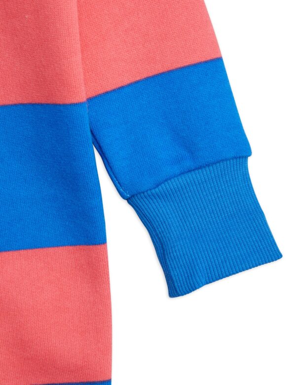 Rosa- och blårandig onesie i sweat-tyg, tillverkad av 100 % GOTS-certifierad ekologisk bomull.