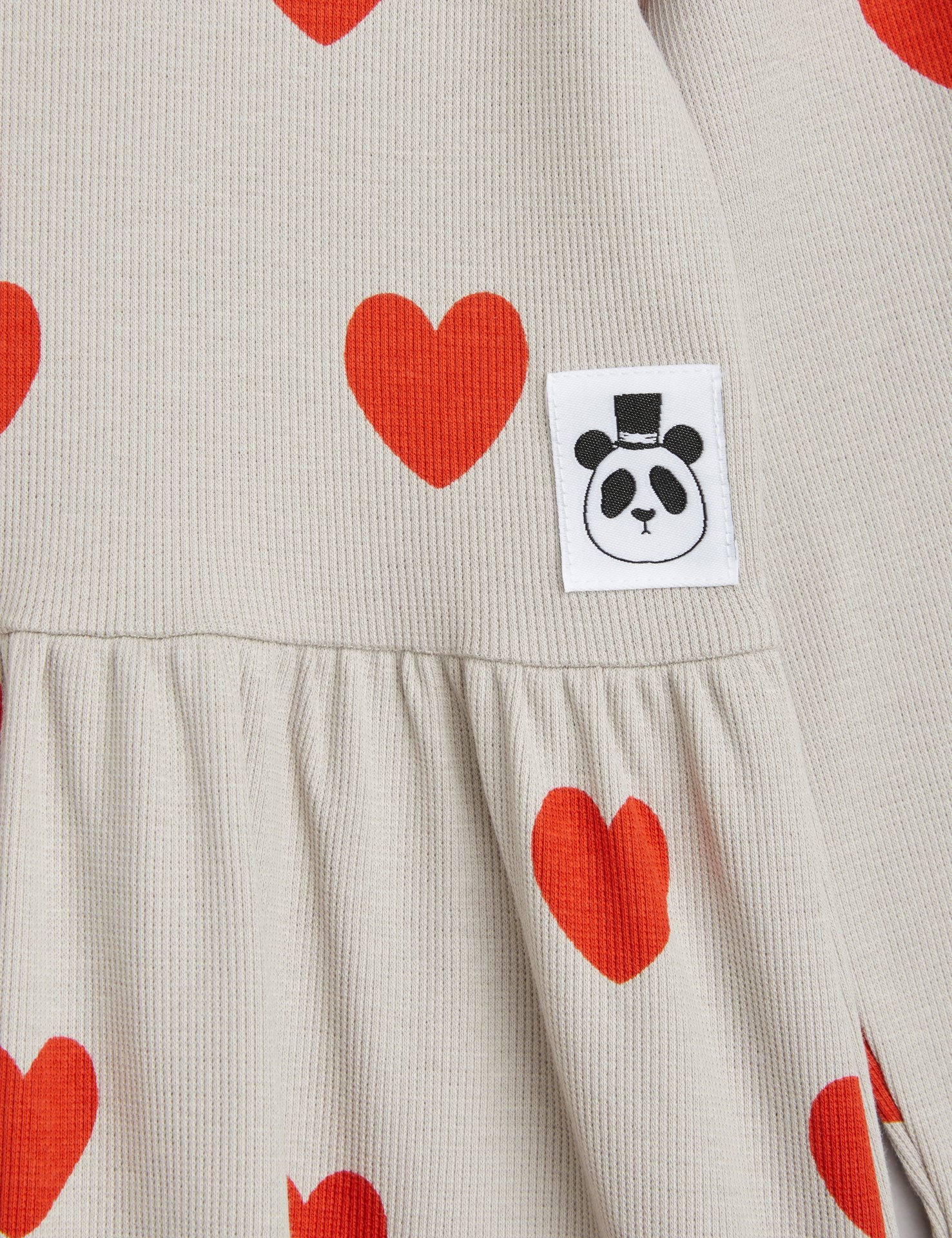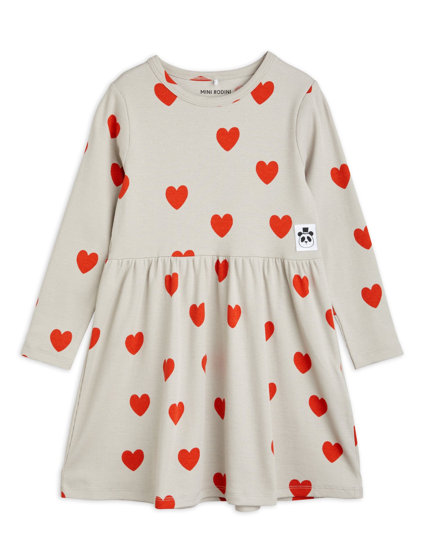 Grå långärmad klänning med heltäckande Hearts-print, tillverkad av GOTS-certifierad ekologisk bomull med stretch.