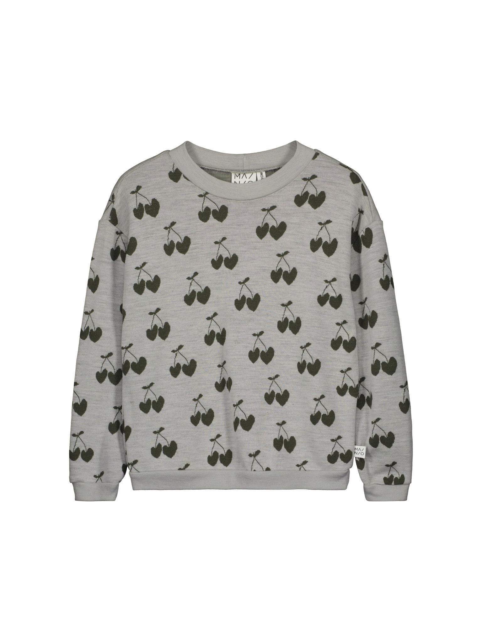 Jacquardstickad tröja, från Mainios AW22-kollektion Future Hopes. Tillverkad i mjuk och varm merinoull med stickat Cherry Love-mönster.