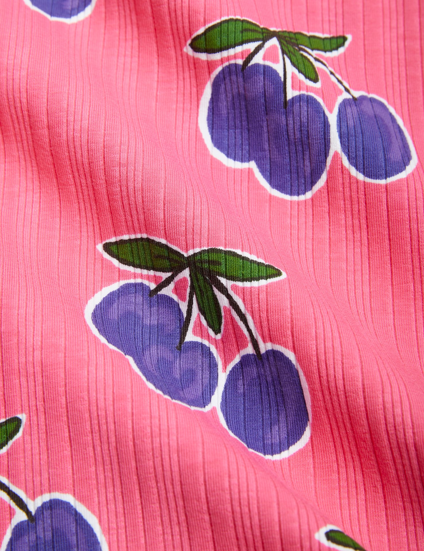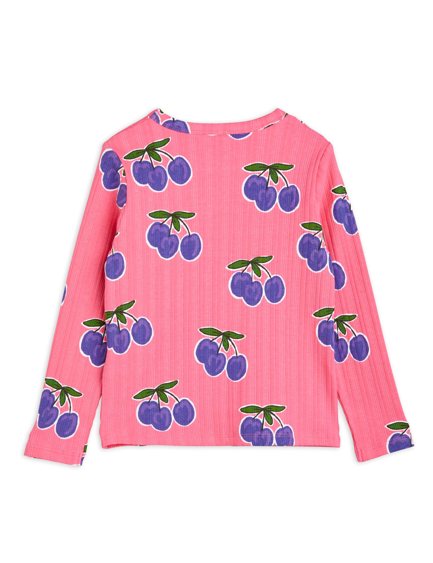 Rosa ribbad långärmad T-shirt med heltäckande Plum-print, tillverkad i GOTS-certiferad ekologisk bomull med stretch.