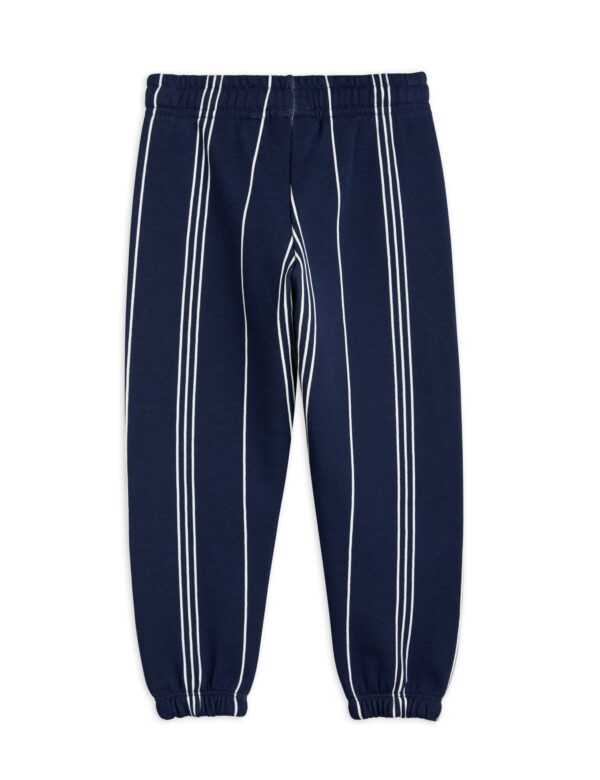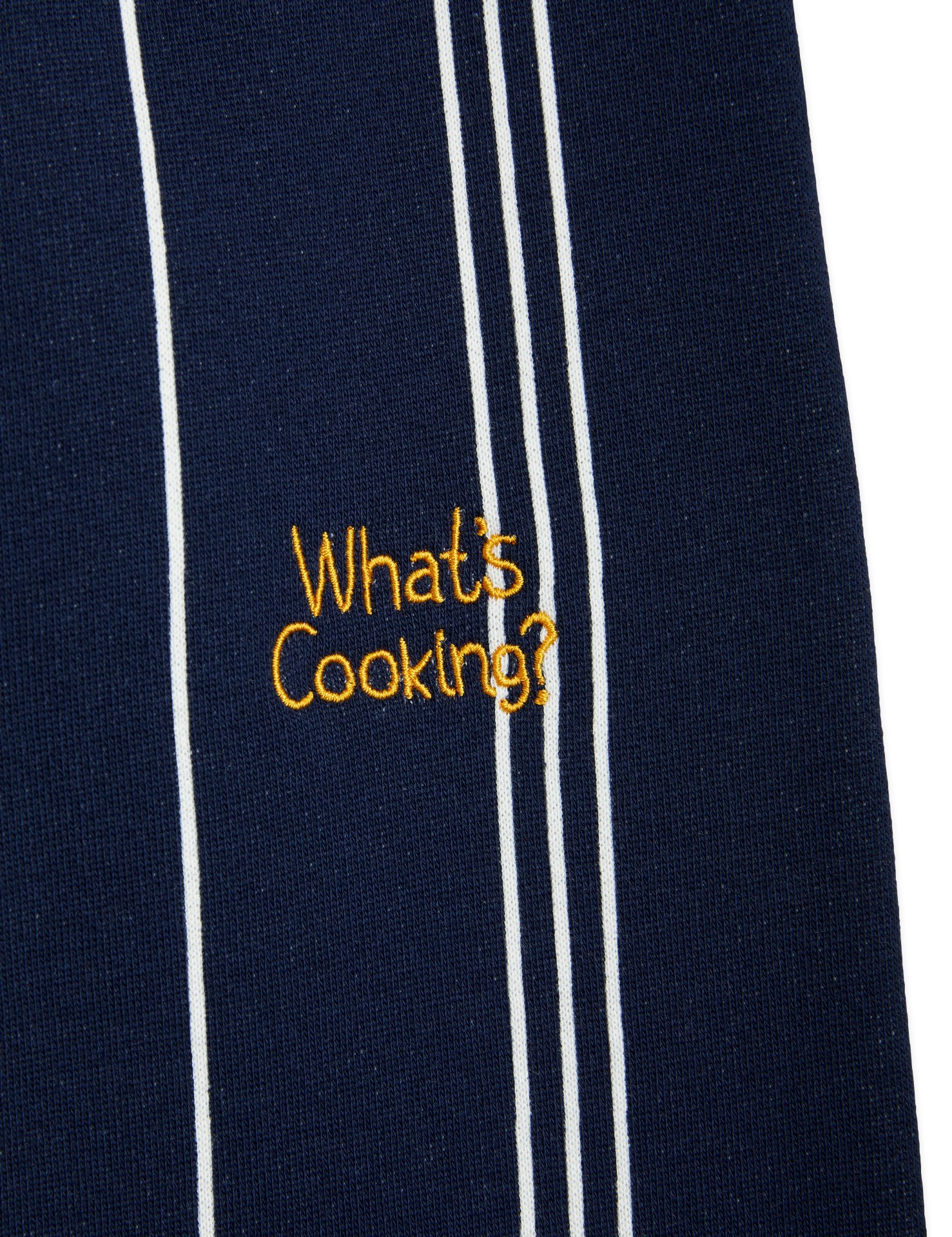 Blå sweatpants med kritstreck och broderat What’s Cooking-motiv, tillverkade av 100 % GOTS-certifierad ekologisk bomull.