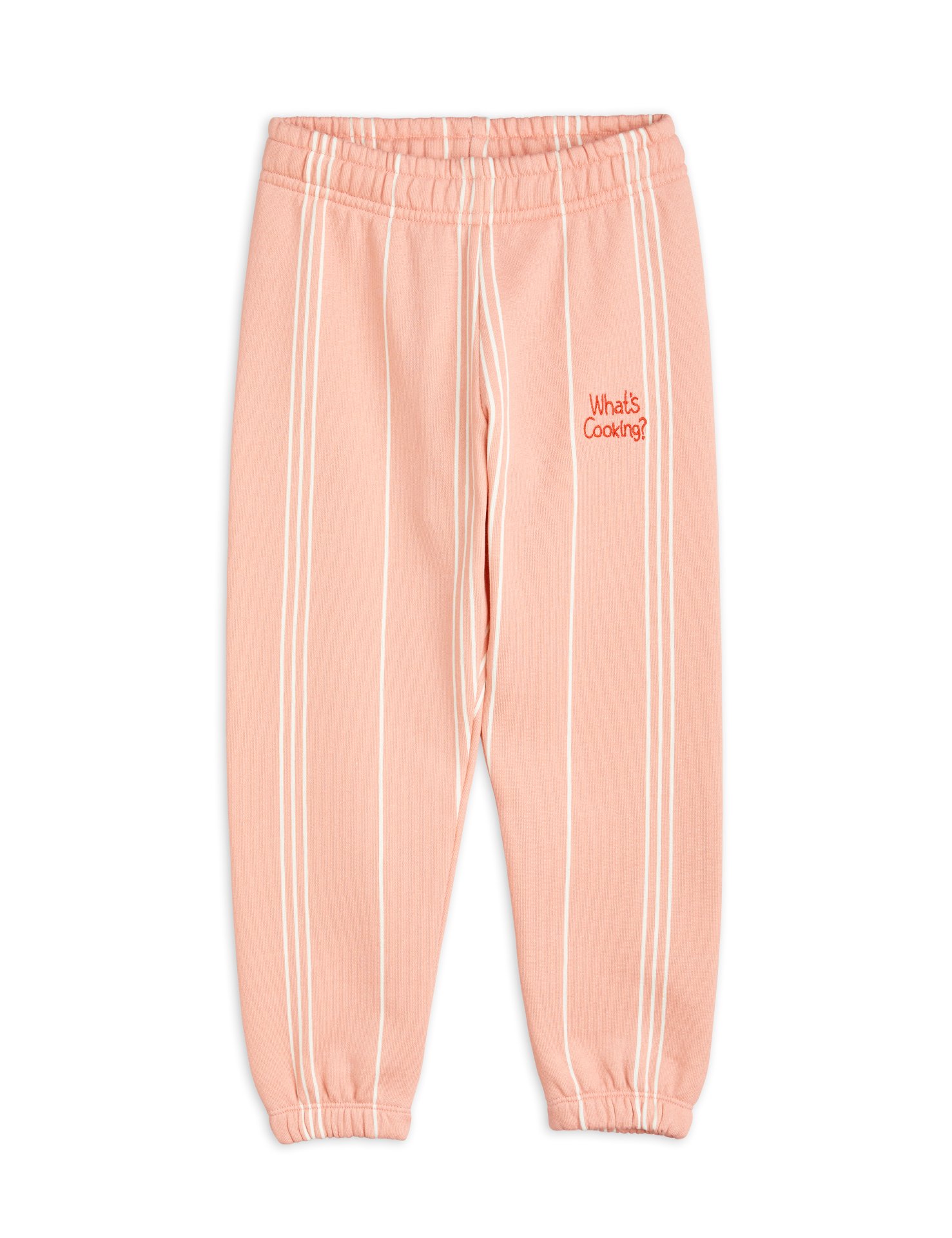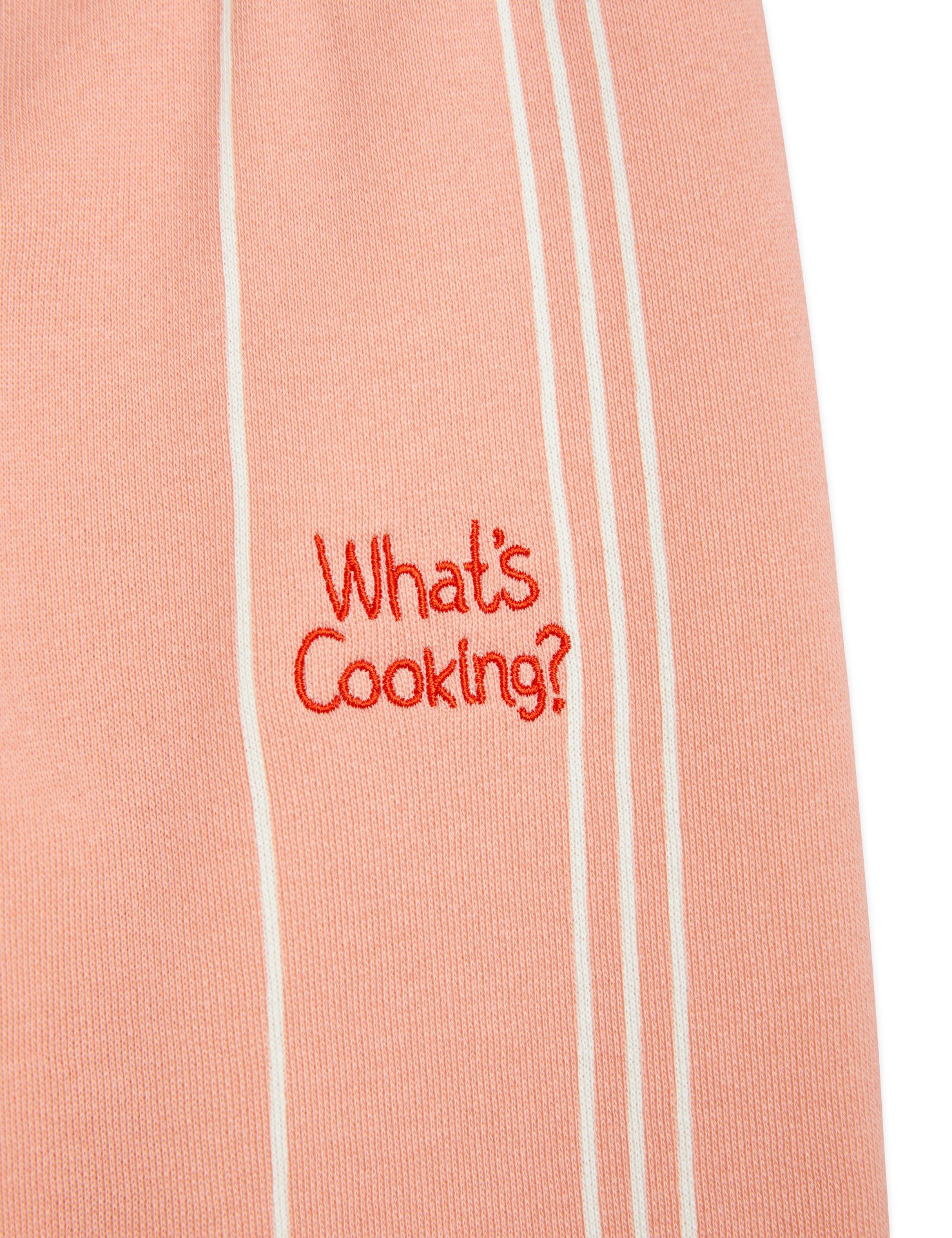 Rosa sweatpants med kritstreck och broderat What’s Cooking-motiv, tillverkade av 100 % GOTS-certifierad ekologisk bomull.