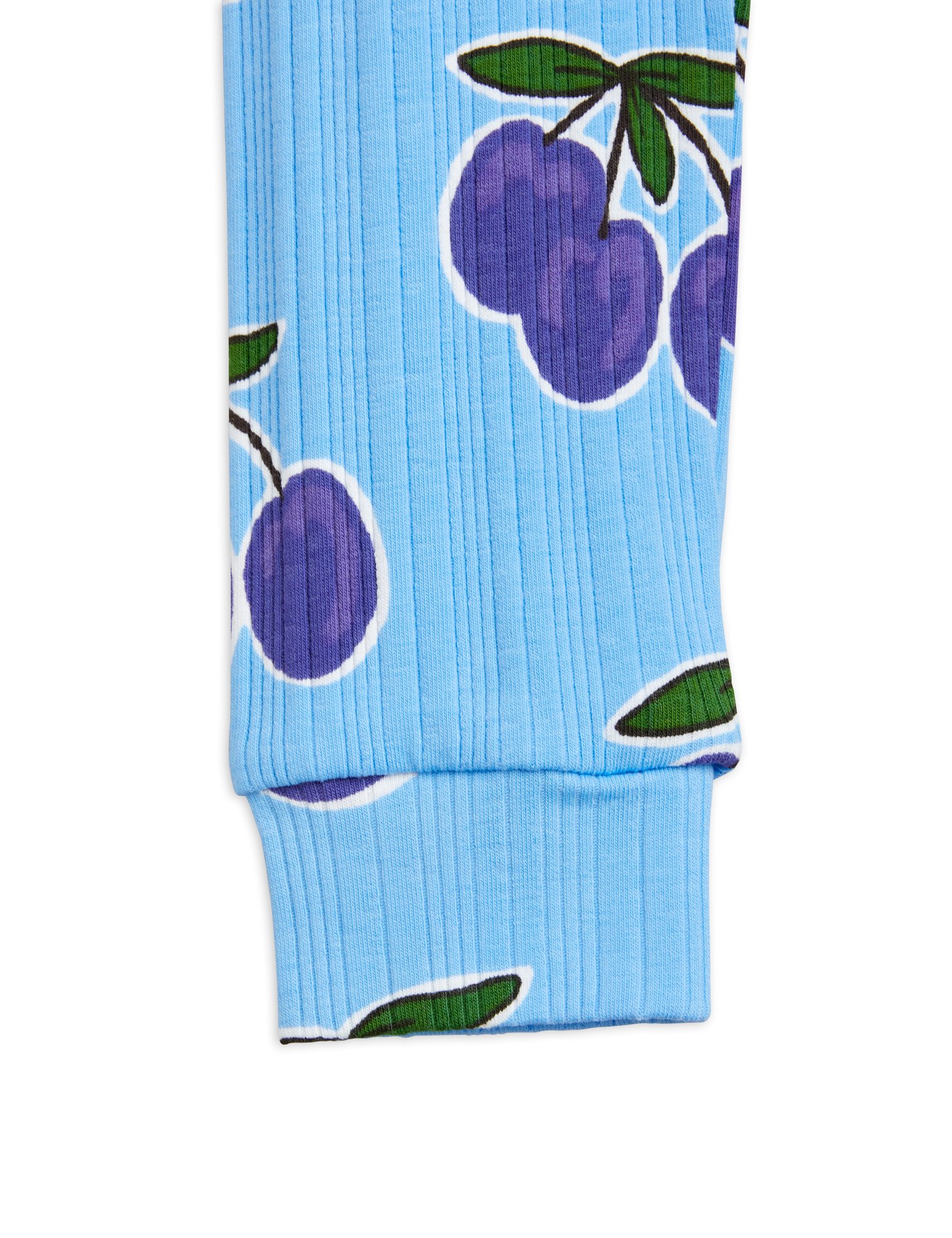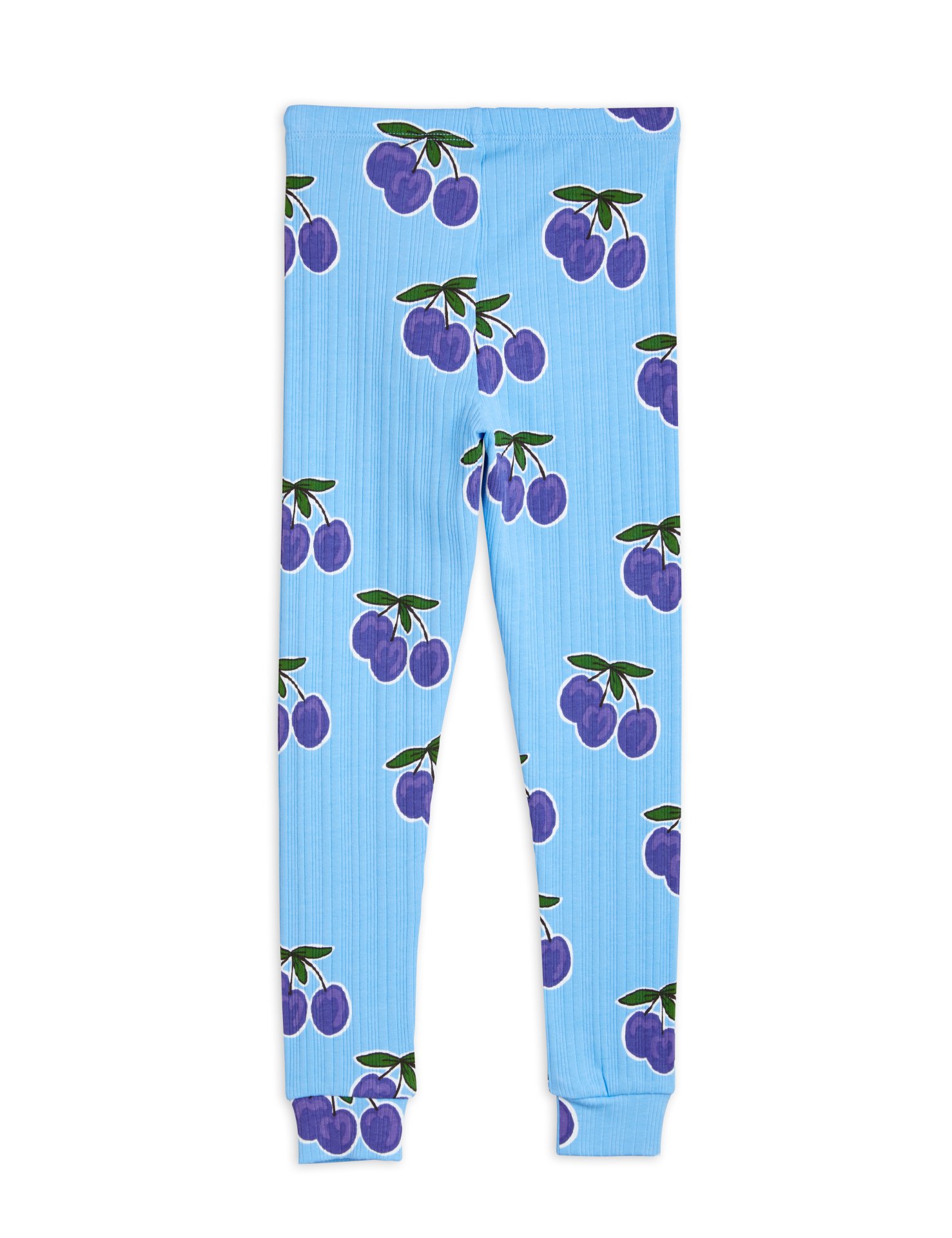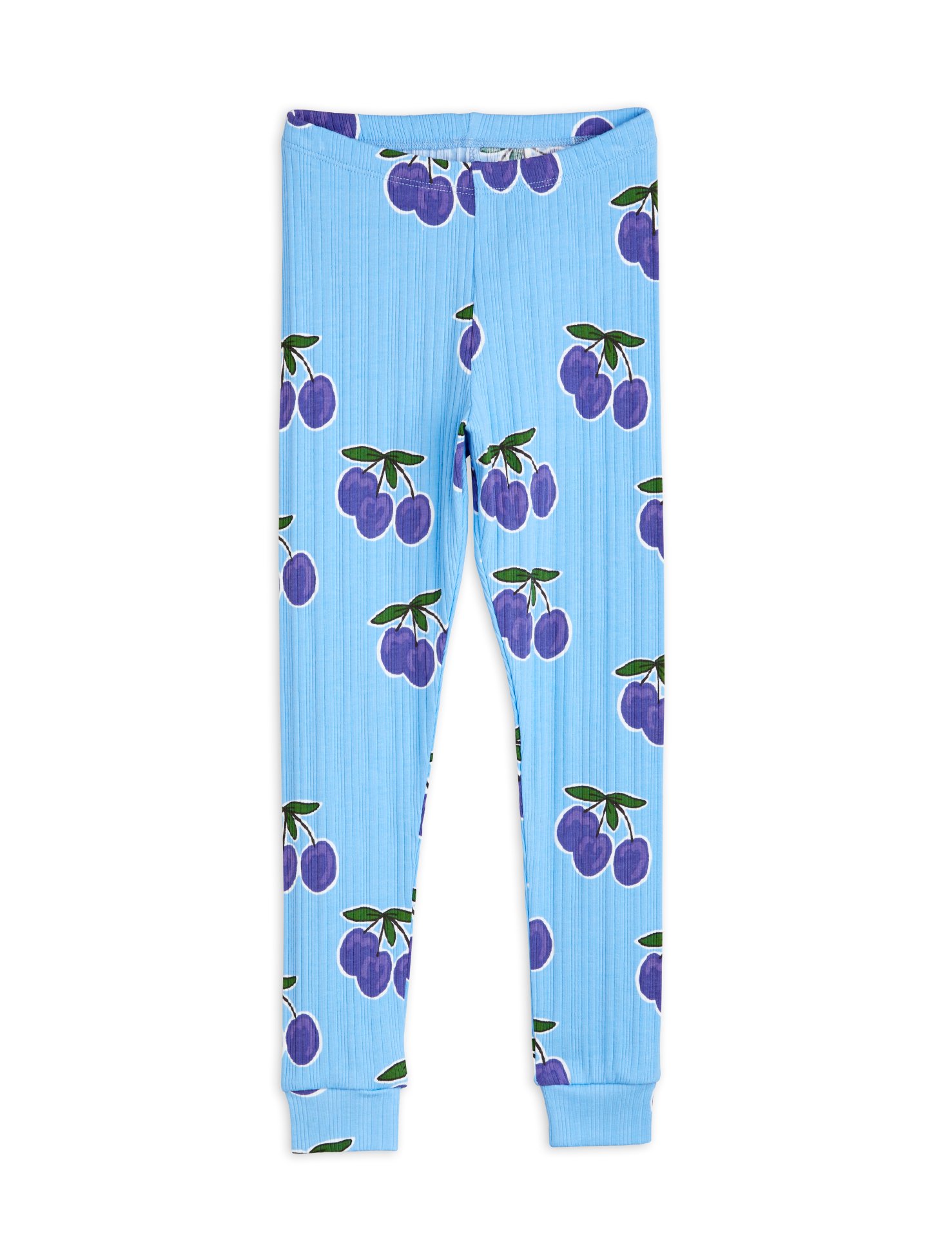 Blå ribbade leggings med heltäckande Plum-print, tillverkade i GOTS-certifierad ekologisk bomull med lite stretch.