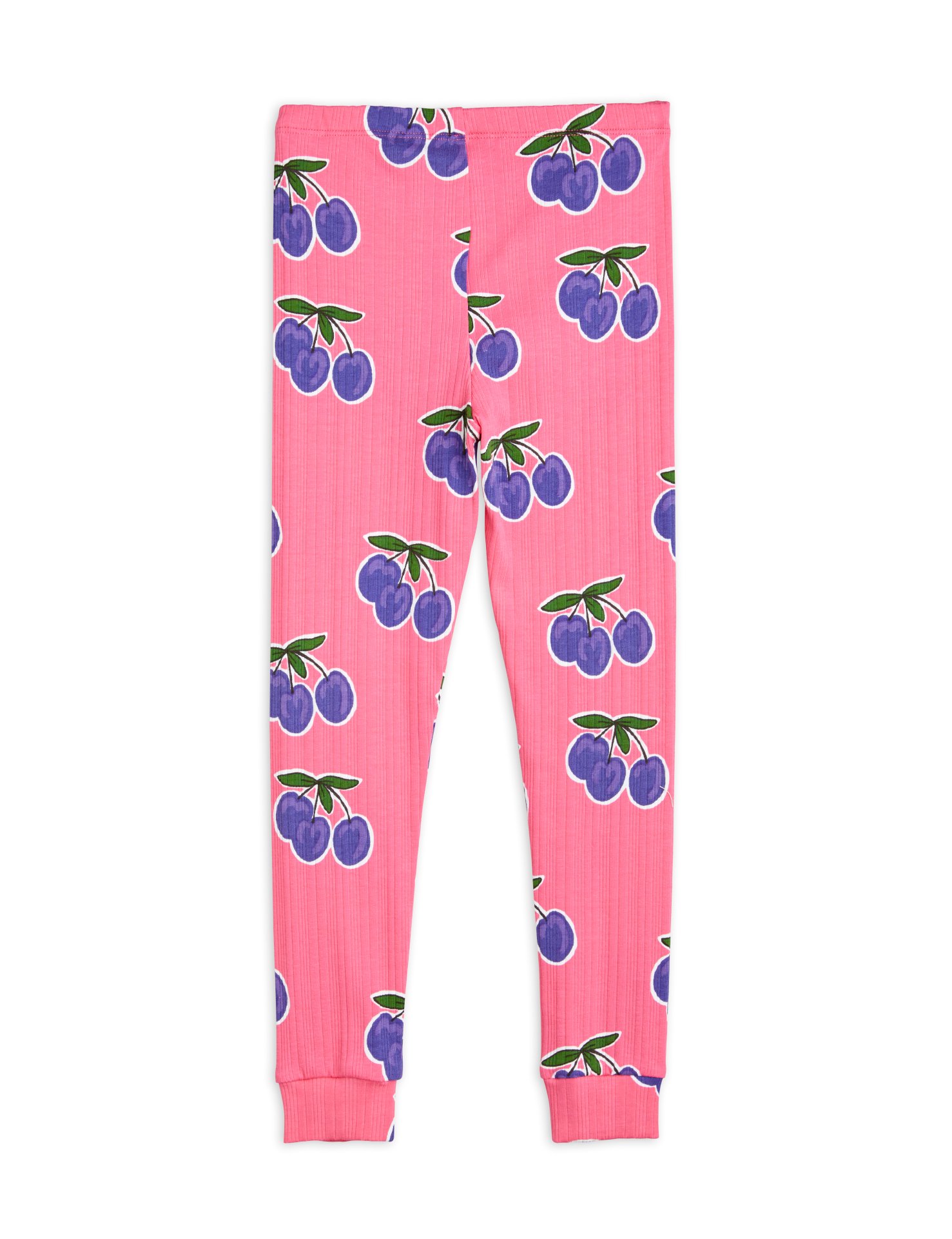 Rosa ribbade leggings med heltäckande Plum-print, tillverkade i GOTS-certiferad bomull med stretch.