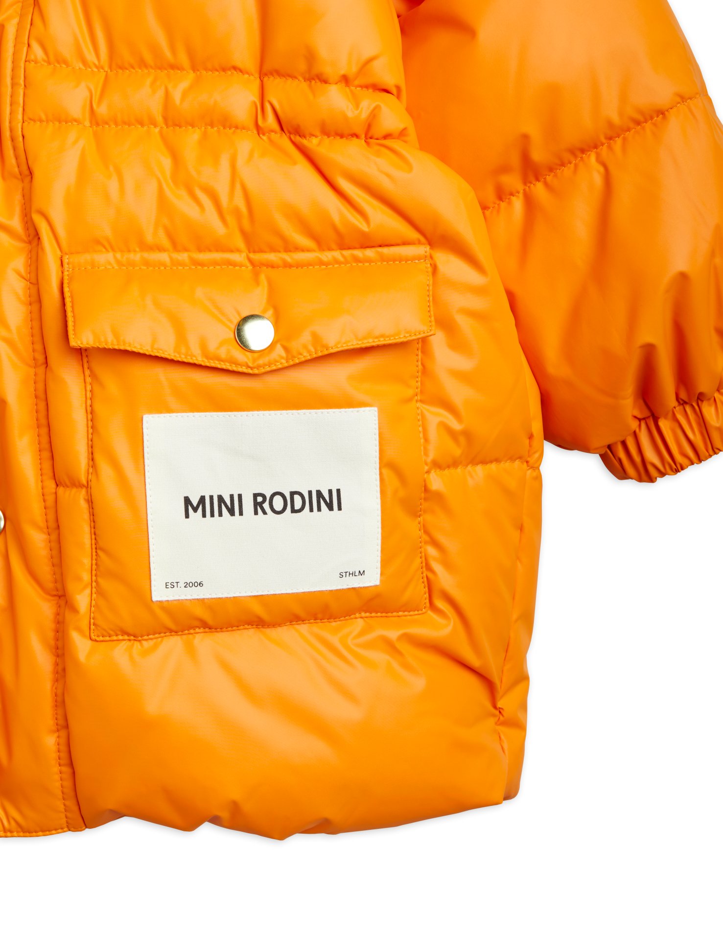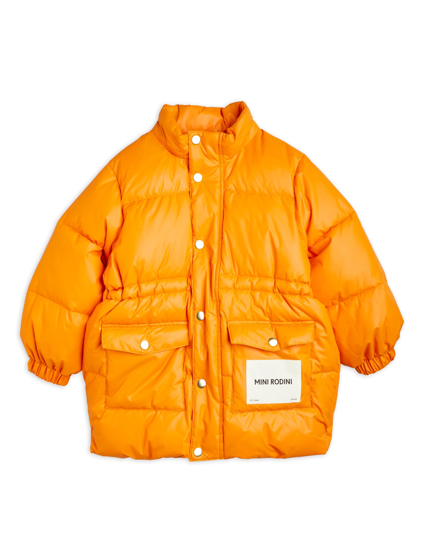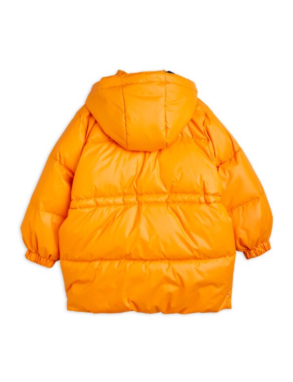 Orange vattenavvisande och vindtät puffjacka med tyngre vaddering samt en Mini Rodini Logotyp-patch på framfickan, tillverkad i 100 % återvunnen polyester. Perfekt för en dag på stan eller i skolan!